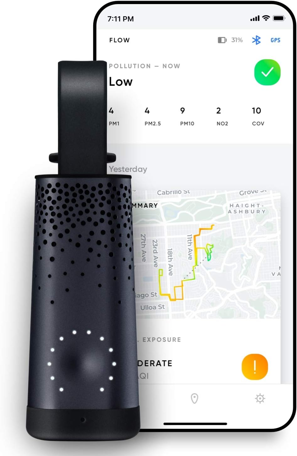 Independent reviews describe Flow 2 as a small handheld or wearable sensor that tracks particulate matter (PM1, PM2.5, PM10), nitrogen dioxide (NO2), and VOCs, with data synced to a smartphone app for mapping pollution hotspots along your routes. The manufacturer presents it as a next‑generation personal air quality monitor for indoor and outdoor use.